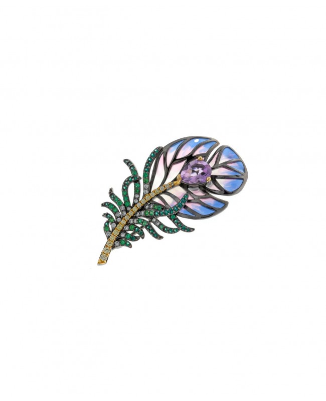 BROCHE PLATA CHAPADO RUTENIO PLUMA AMATISTA PERA CIRCONITA VERDES AMARILLAS ESMALTE LILA AZUL