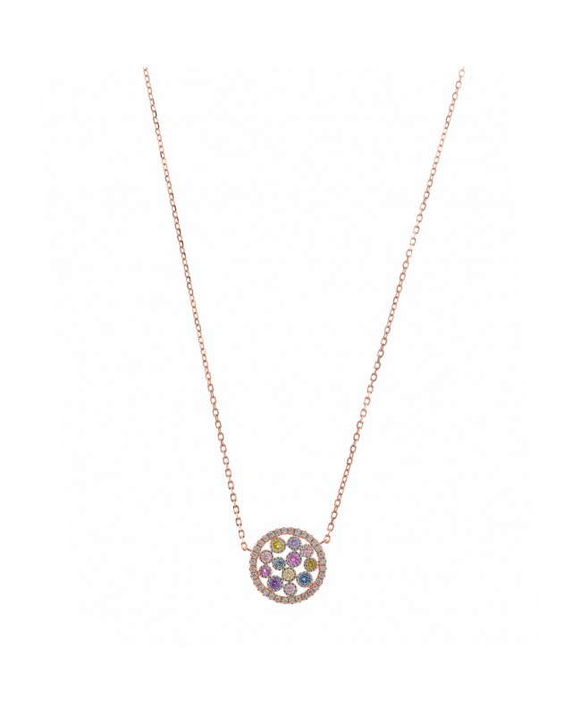 COLLAR PLATA CHAPADO ROSA CIRCULO CIRCONITAS MULTICOLOR SOBRE RODIO BORDE CIRCONITAS BLANCAS