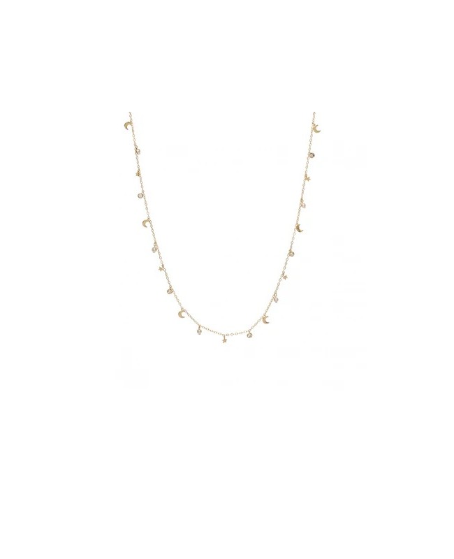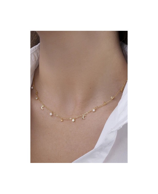 COLLAR DE PLATA BÑADO EN ORO CON MOTIVOS VARIADOS DE LINA , ESTRELLAS, PERLAS Y CIRCONITAS BLAMCAS