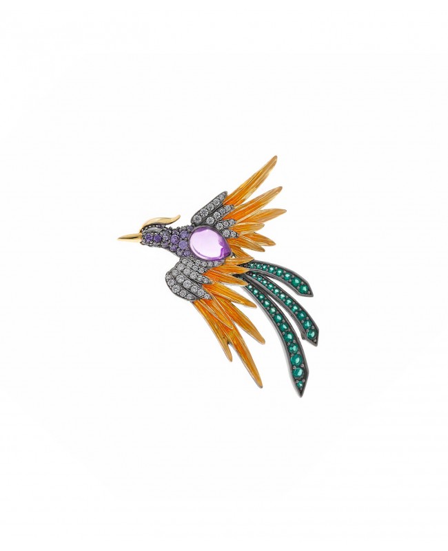 BROCHE PLATA CHAPADO RUTENIO AVE FENIX AMATISTA PERA CIRCONITAS VERDES LILAS BLANCAS ESMALTE AMARILLO