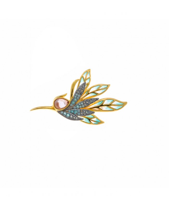 BROCHE PLATA CHAPADO DORADO COLIBRI AMATISTA PERA CIRCONITAS VERDES ESMALTE VERDE. MEDIDA ALTO 3CM ANCHO 5CM