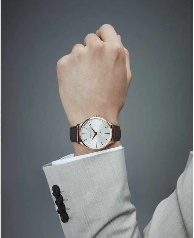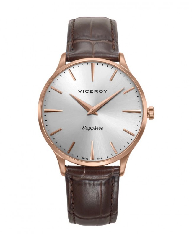 Reloj caja de acero Ip rosa 5 Atm, correa de piel marron, movimiento cuarzo Suizo, Swiss made
