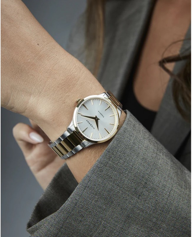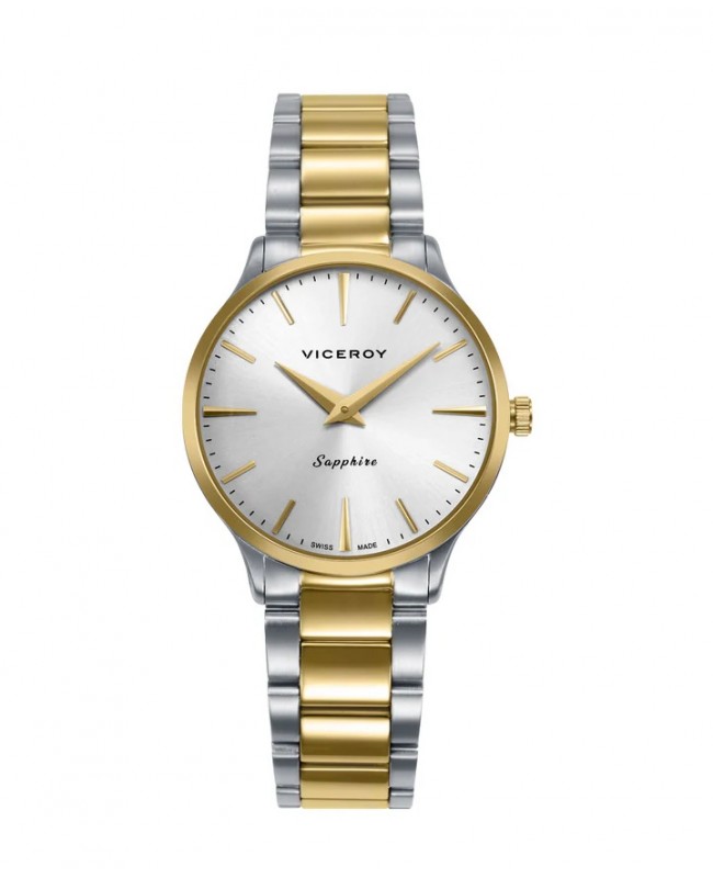 Reloj caja bitono de acero e Ip dorado 5 Atm, brazalete bitono de acero e Ip dorado, movimiento cuarzo Suizo, Swiss made