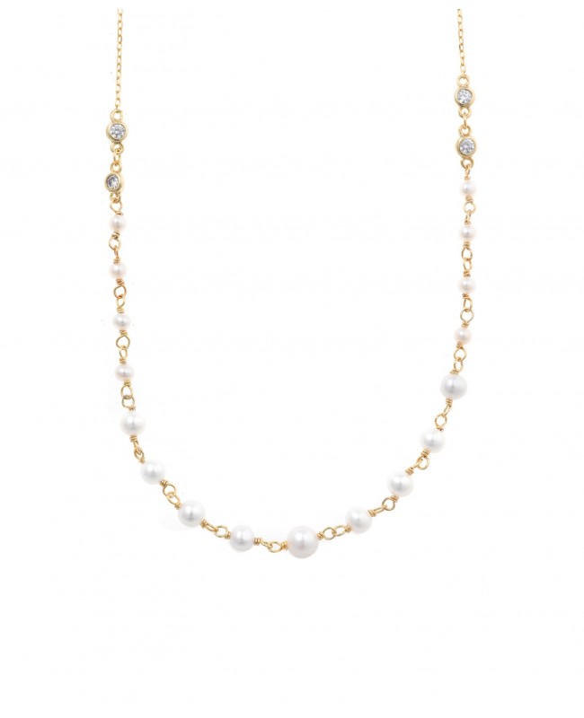 COLLAR PLATA CHAPADO DORADO PERLAS DE AGUA DULCE Y CHATONES CIRCONITA BLANCA