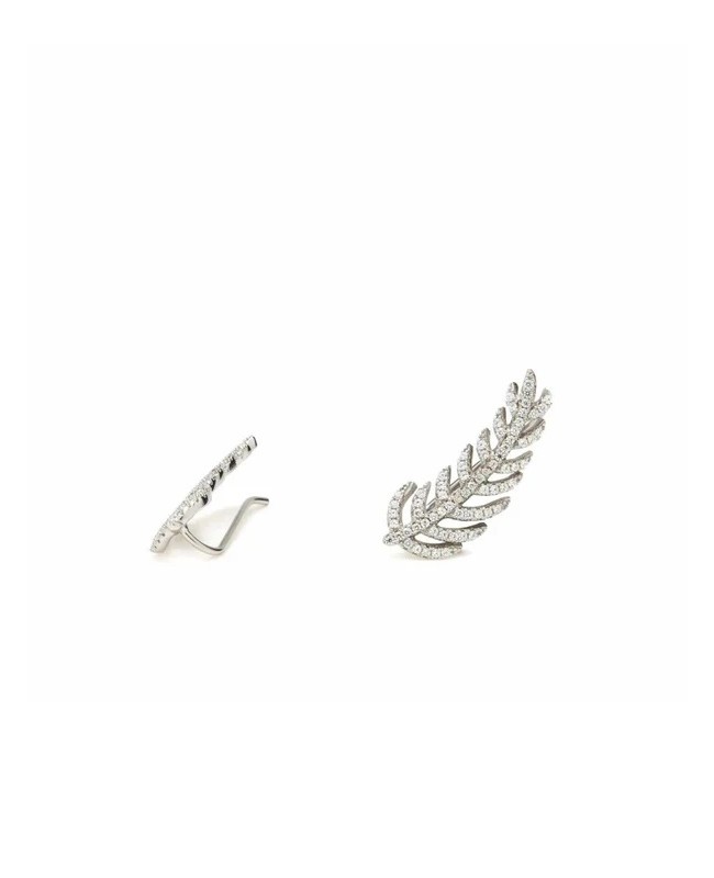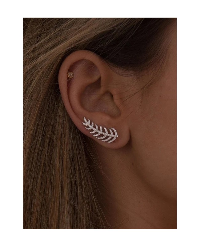 Pendientes trepadores de plata con un motivo con forma de hojas revestidas con pequeñas circonitas engastadas, colocadas en tamaño decreciente. Estos pendientes se llevan hacia arriba y se adaptan perfectamente al contorno del lóbulo